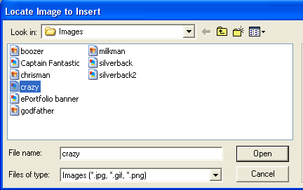 - Browse for the image you want to place on the page. It should be inside of the Images folder in your ePortfolio folder on the Desktop.