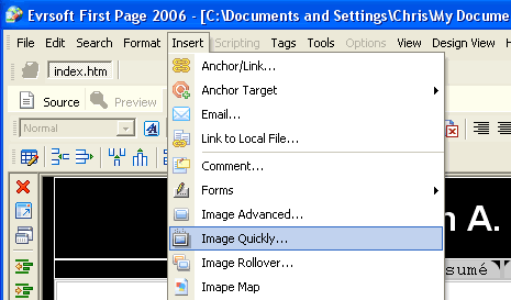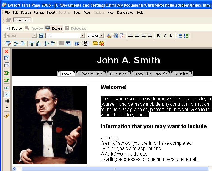 Once you have an image saved in your Images folder, you can actually add the image to your Web page. Since we have the index page open in First Page, let′s try to replace the image of Don Corleone with one of your own images: