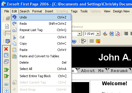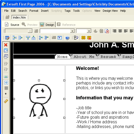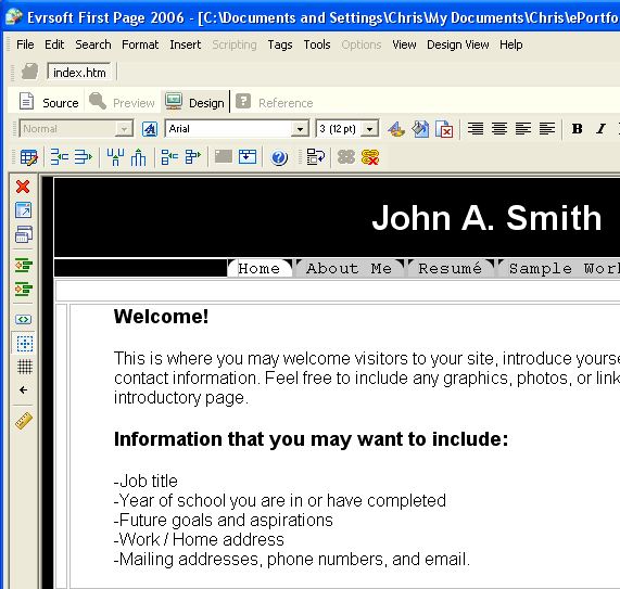 The page will now load in a design format where you can simply select text to modify it. Since this is a template, all of the menu items are already set up to go to their own pages (please do NOT try to modify or add menu items!), so all that you have to do is add your name at the top of the page and enter your own information and picture in the content section of the page. To add your own words and content: