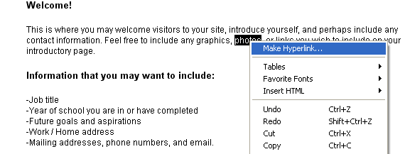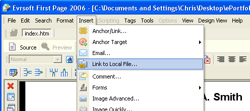 Likewise, you can also create relative links to any of the other html files in your ePortfolio folder. In fact, all of the links on the main menu of your ePortfolio are linked to each other using relative links. If you want to make a link to one of these pages, you can use the same process as above; the only difference is that you would make the link to one of the html files rather than a document. Just remember, if the document or html file has not been saved locally (within the same parent ePortfolio folder), you will not be able to create a working link to it.