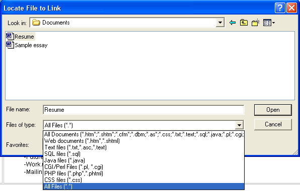 - Browse for the file that you want the link to open. It should be in your Documents folder in your ePortfolio folder on the Desktop. Under the "Files of type:" option, you may need to select All Files before you can find the file.