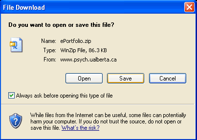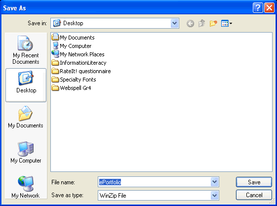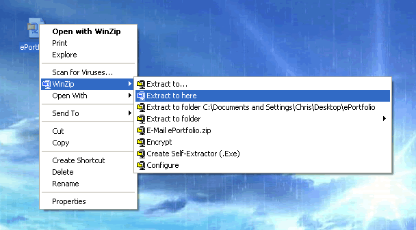 The file that you just downloaded is a zip file. This means that the folder that contains your ePortfolio package has been compressed into one file, and in order to access the contents of the folder you must first ‘unzip’ the file. You can unzip the file with WinZip, which your computer should already have, but if it doesn′t you can download it here. To unzip the file: