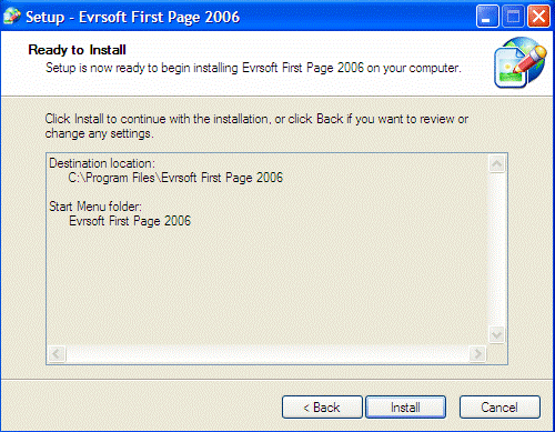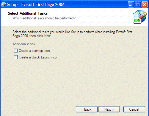 - Make sure that the check boxes are left unchecked (if you want First Page to have a desktop icon on your computer, make sure that box is checked). Click Next.